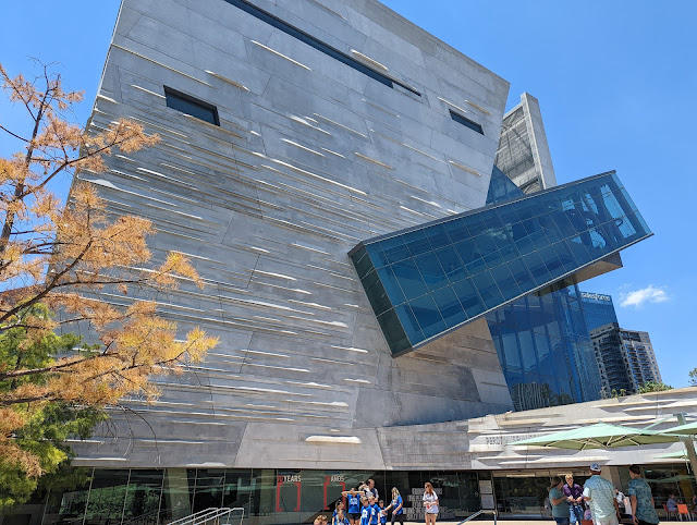Today we picked up Erika and headed into the big city, The Big D!  We were visiting The Perot Museum of Nature and Science.  In 2008, $50 million dollars donated by The Perot Heirs (Ross and Margot Perot's kids) sealed the deal on the name change from The Museum of Nature & Science at Fair Park to The Perot Museum of Nature and Science.  The building is amazingly cool.  You start out by heading to the top and then you work your way down.  Each floor as an overlook looking down on the floor you are headed to so you can get a preview of what is in store.  Erika has a membership and we have our ASTC reciprocal pass so we all got in for free.  We tried to go later in the day but it was still packed with children.  We did are best to distance ourselves and saw as much as we could for as long as we could hang in there.  It was a very hot day and they had the air conditioning blaring so I don't blame families for going there to cool off.  I guess we will steer clear of Science and Nature museums until school is in again and stick to art museums.