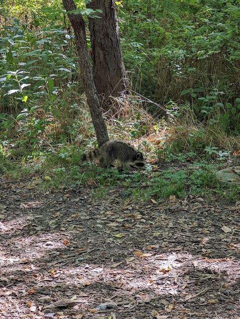 We used the map to walk to the back of the property and found the bird feeders and little house. There was a young racoon eating seeds and it didn't look super healthy so we waited for the racoon to get their fill before moving on to the little house and seating area.