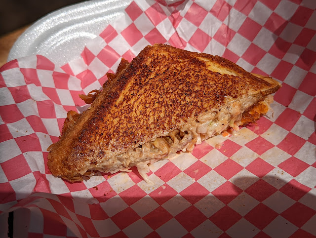 Max Groove is a local musician and he has an internet Jazz Radio show a couple of times a week. We could smell the food truck from a block away so we looked to see if anything looked good. It did so we split a KC Melt (BBQ Pulled Pork w Coleslaw and Cheese on Texas Toast) while listening Free Live Jazz Music on a Wednesday morning.
