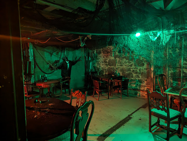 | The bathrooms were downstairs and that area amped up the creepiness' as well as the jump scares. There were multiple things that caused jump scares throughout The Manor. |