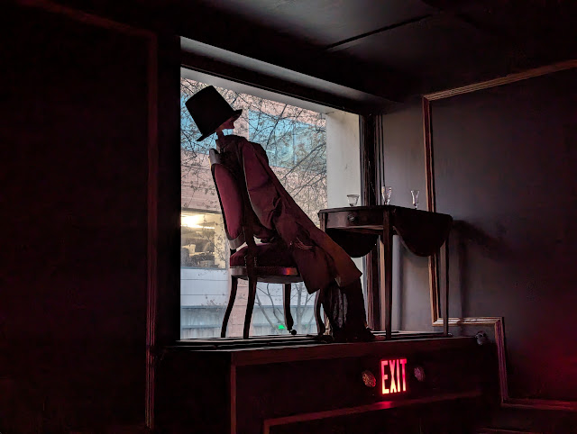 Raven's Manor, a Haunted Mansion themed bar, for happy hour. The theming is amazing and their cocktail program is fantastic. They have regular cocktails, as well as cocktails that come with really cool presentations. They even have a special ticket you can book where you enter a private laboratory and build your own concoctions. We make our own cocktails at home so we decided to not have this experience, but people appear to love it.